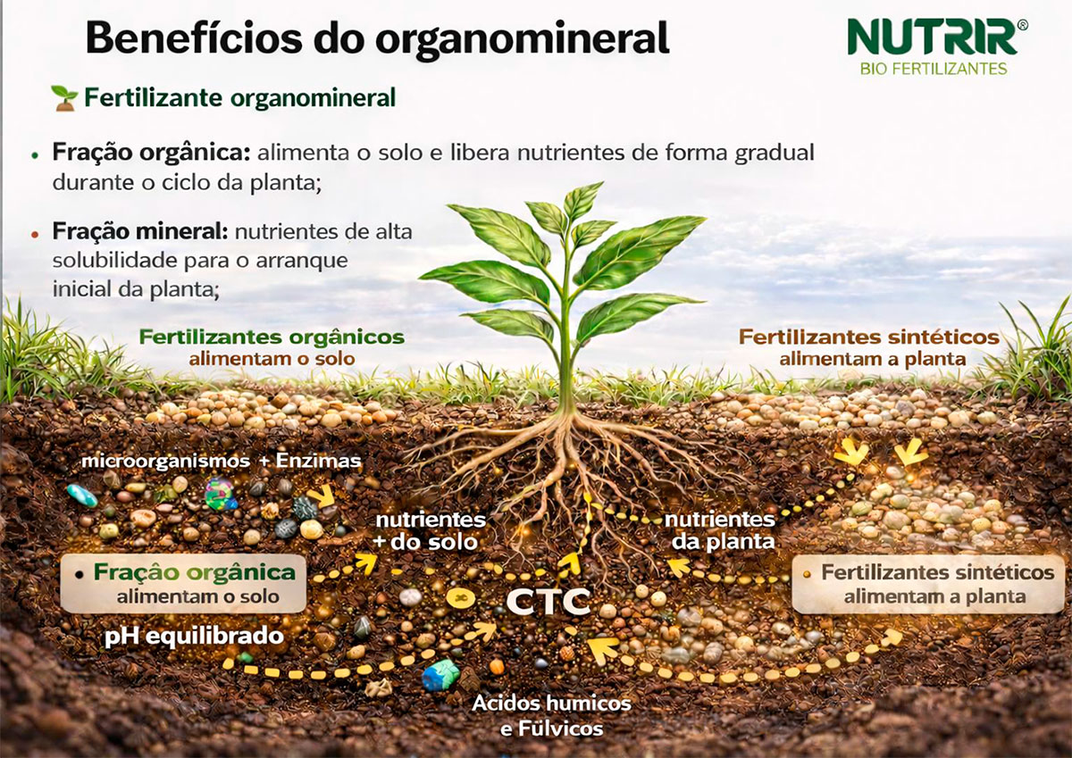 O fertilizante organomineral é um insumo agrícola resultante da combinação de matéria orgânica estabilizada com fontes minerais de nutrientes, desenvolvido para unir os benefícios dos fertilizantes orgânicos e minerais em um único produto.