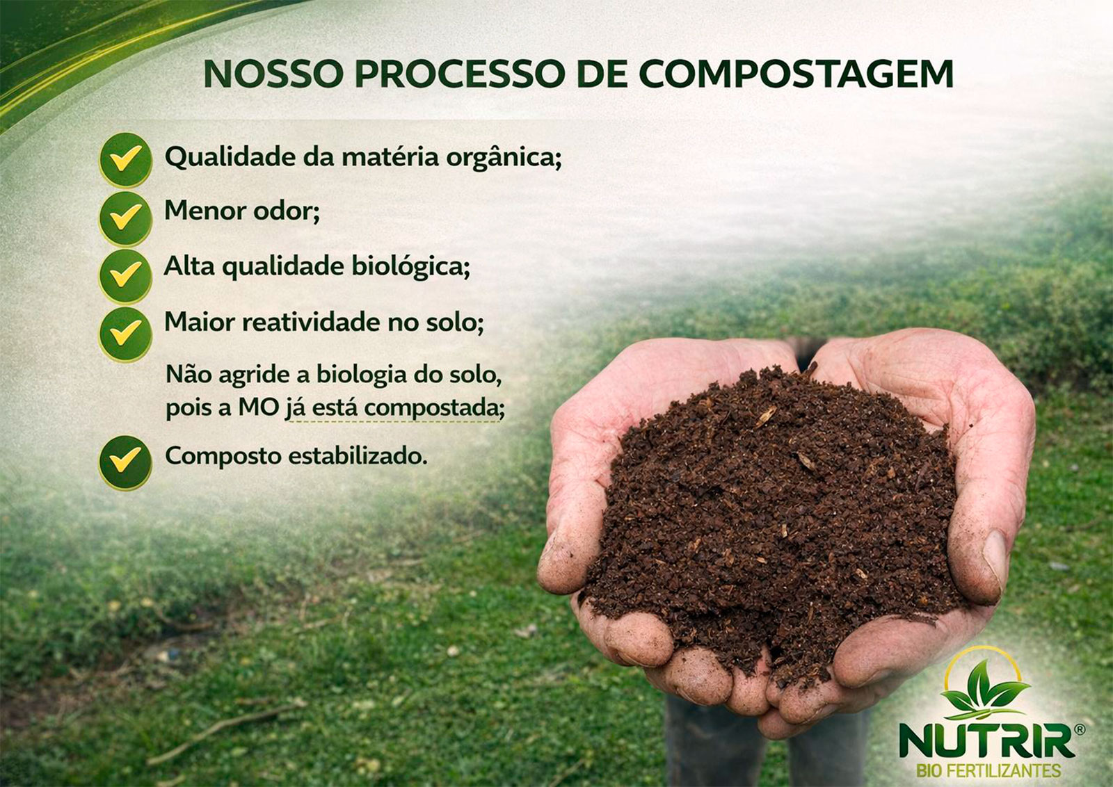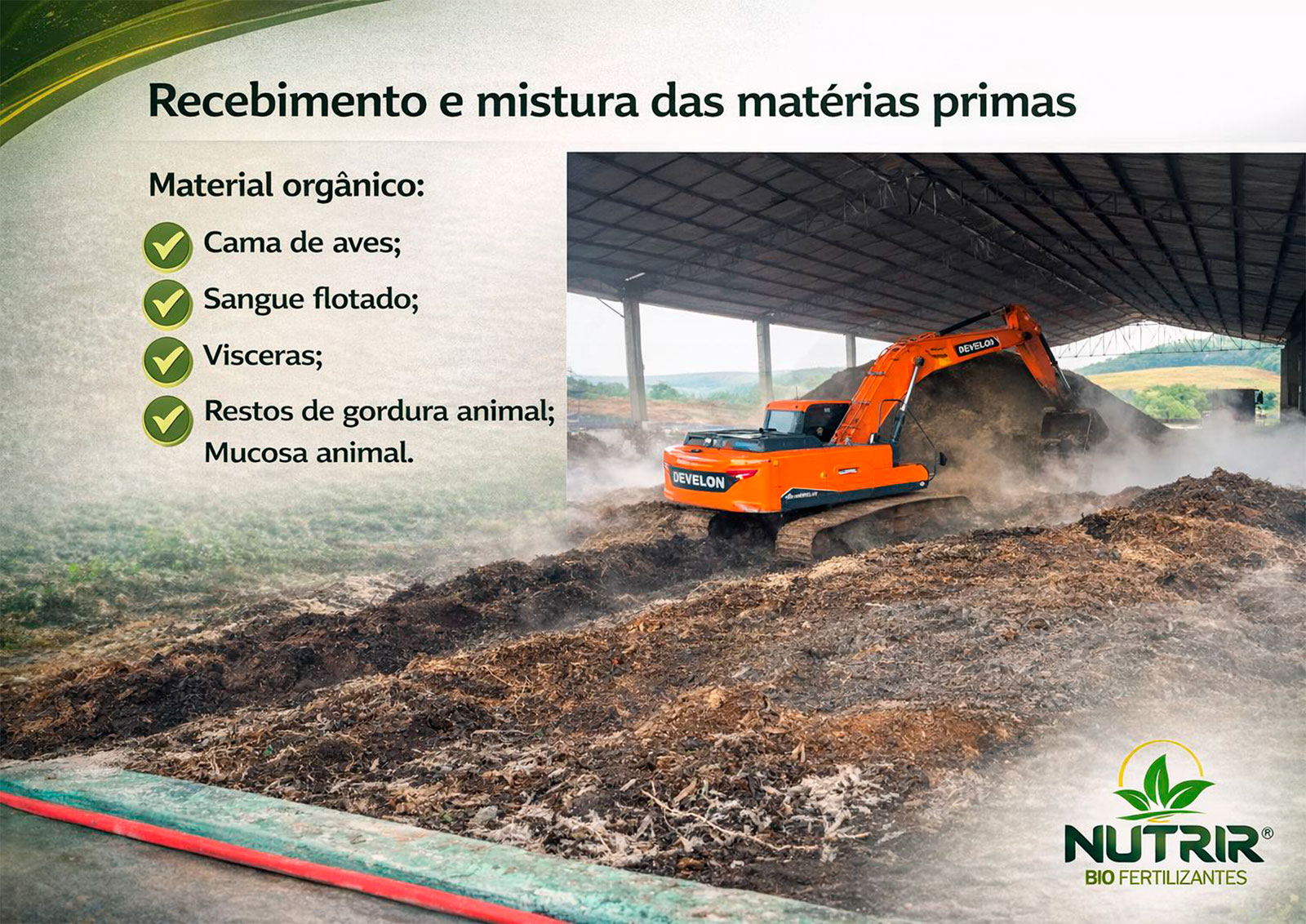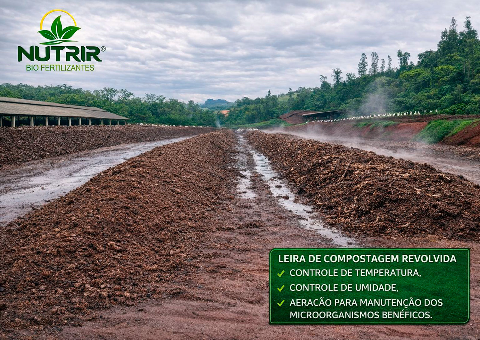 Nosso processo de compostagem é estruturado em etapas sequenciais: recolhimento dos resíduos orgânicos, armazenamento com controle de umidade e temperatura, secagem para estabilização do material, revolvimento mecânico para otimização da atividade microbiológica e moagem final visando à uniformização do produto.